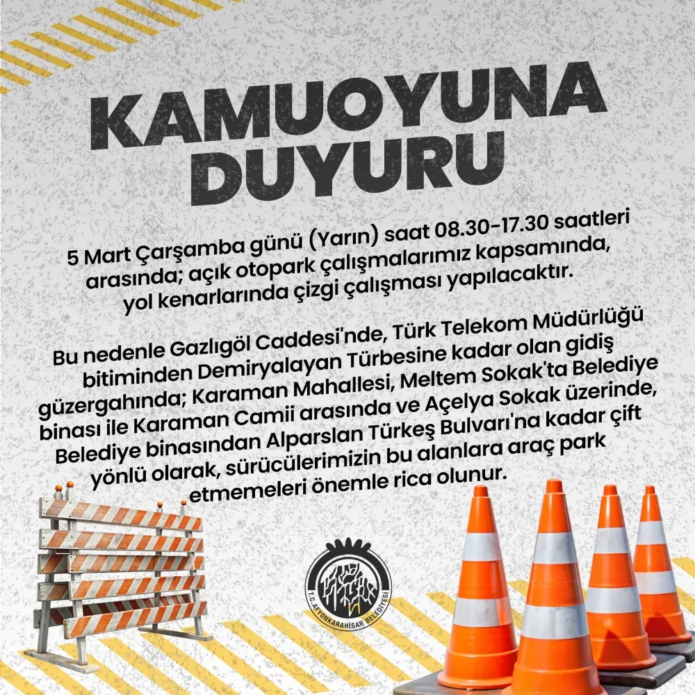 Afyonkarahisar Belediyesi, 5 Mart Çarşamba günü saat 08.30 ile 17.30 arasında açık otopark düzenleme çalışmaları kapsamında yol kenarlarında çizgi çalışması gerçekleştirecek. Çalışmaların düzenli ilerleyebilmesi için sürücülerden belirlenen alanlara araç park etmemeleri istendi.