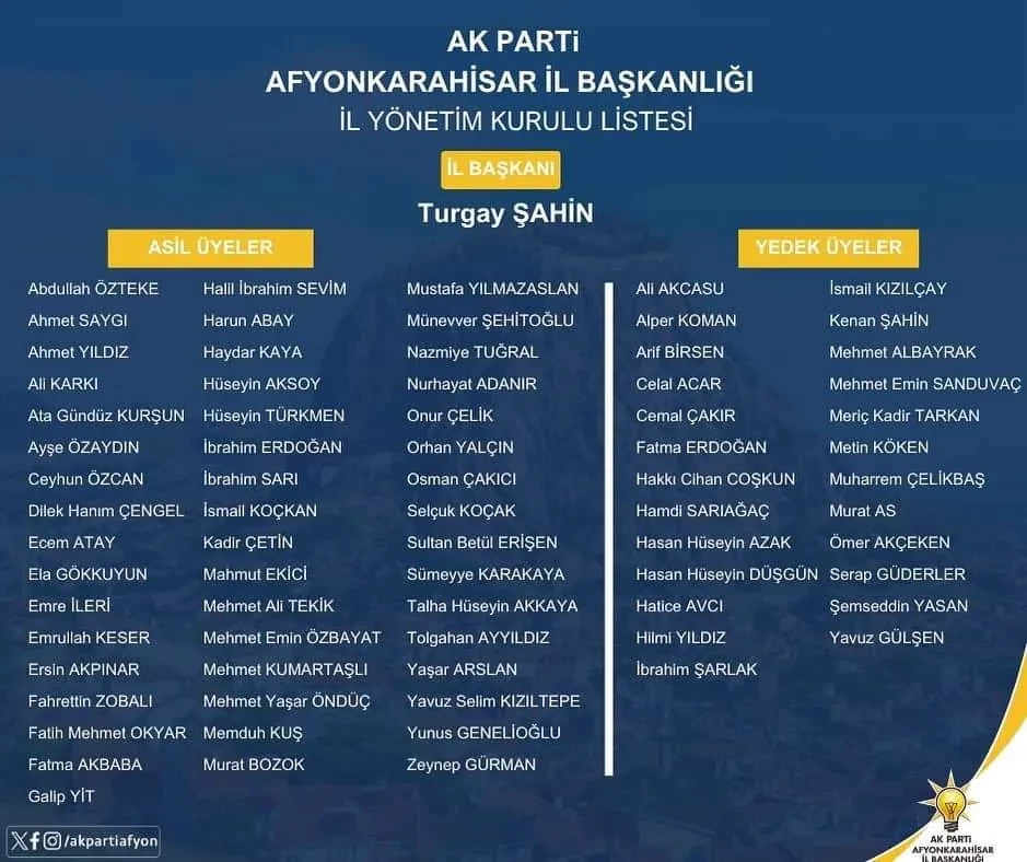 AK Parti Afyonkarahisar İl Başkanlığı, yeni yönetim kurulu listesini duyurdu. Turgay Şahin'in il başkanı olduğu listede, asil ve yedek üyeler de belirlendi.