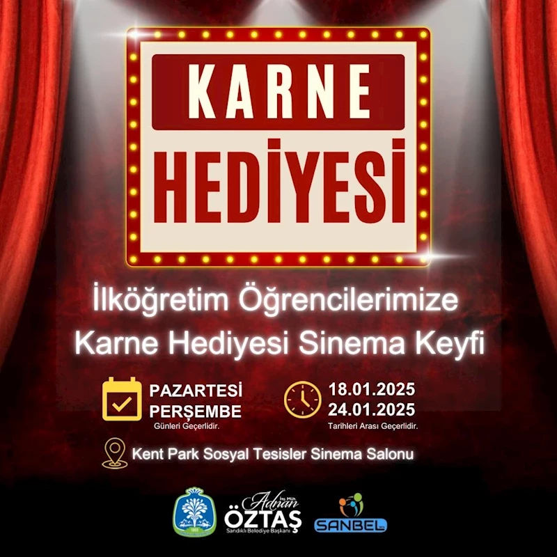 Sandıklı Belediyesi, ilköğretim öğrencilerine özel bir karne hediyesi hazırladı. Kent Park Sosyal Tesisleri Sinema Salonu'nda, 18-24 Ocak 2025 tarihleri arasında, Pazartesi ve Perşembe günleri ücretsiz sinema keyfi sunulacağı duyuruldu.