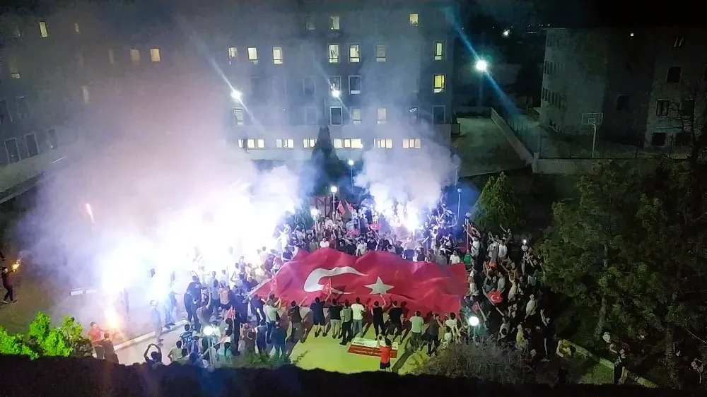 Türkiye’nin Avusturya’yı 2-1 yenerek çeyrek finale yükselmesinin ardından Tınaztepe Yurt Müdürlüğü bahçesinde dev Türk Bayrağı açan gençler, galibiyet coşkusunu hep birlikte yaşadılar.
